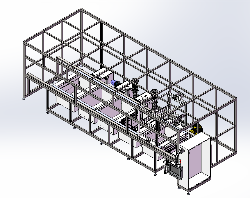 工作程序:設(shè)計為全自動龍門式傳遞形式,傳遞工件料籃形式從左進右出;工件料籃通過自動傳送系統(tǒng)進行自動進料和自動出料。
